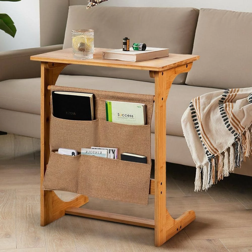 The C-shaped tray table stands steady on the floor and you can place it beside your bed or sofa as a laptop table, coffee table or end table to save space. On the back of the side table, there is a storage bag have different sizes of pockets to help you store sundries. In addition, the corners of this side table are round and smooth to prevent bumping and hurting. And painted with varnish, the whole side table is waterproof and convenient to clean with cloth.