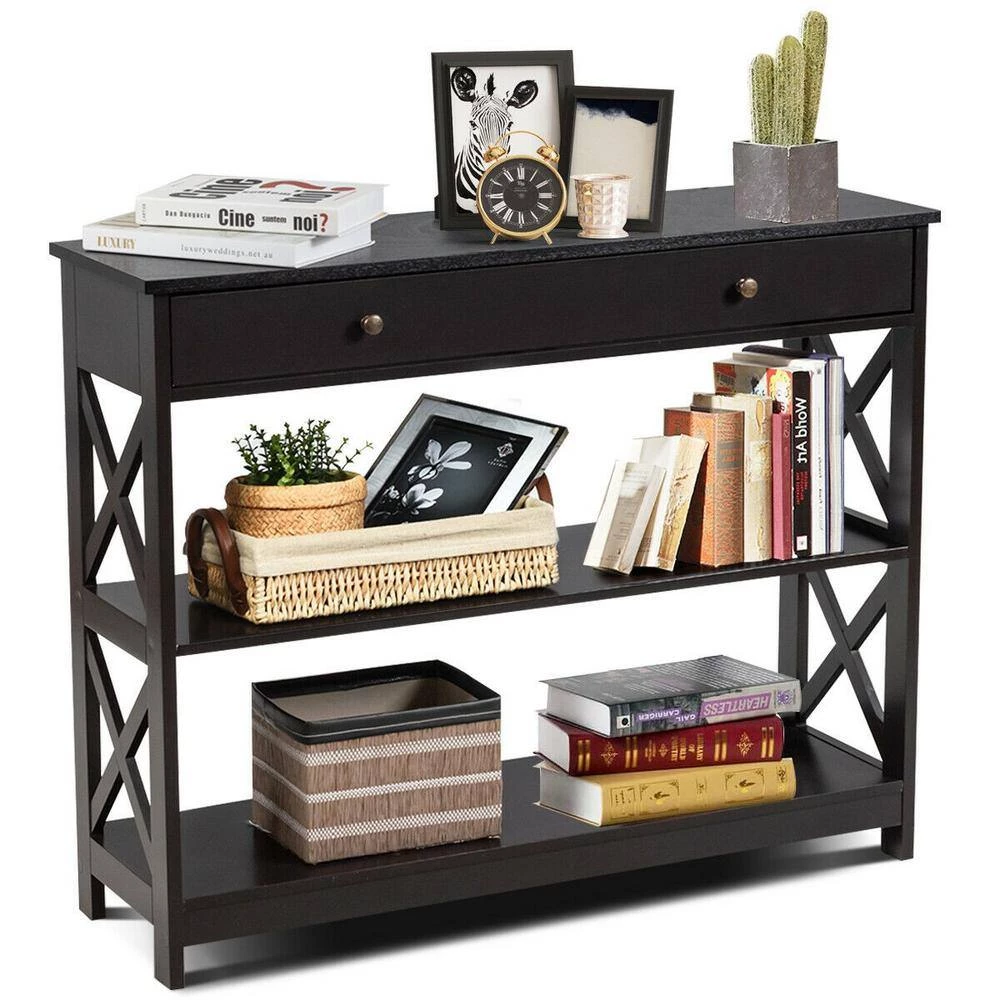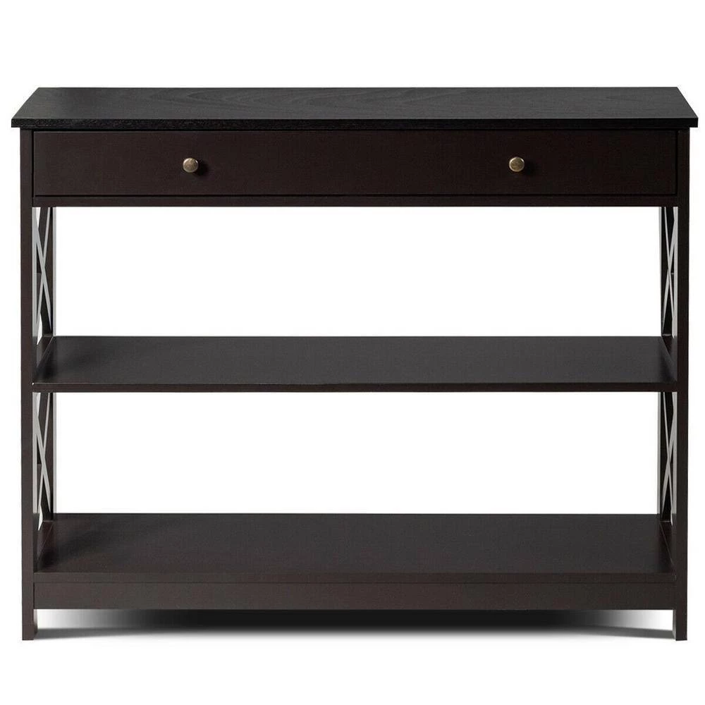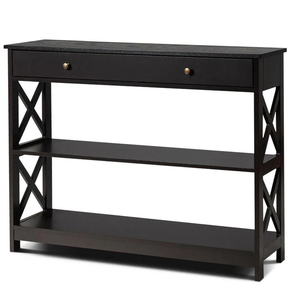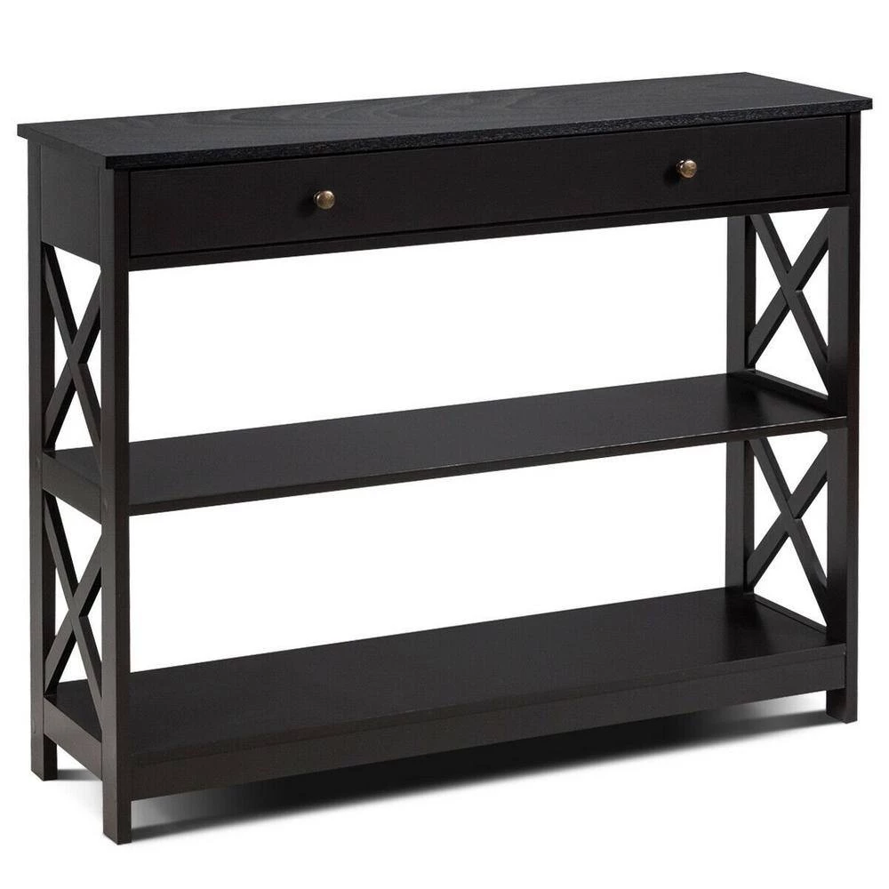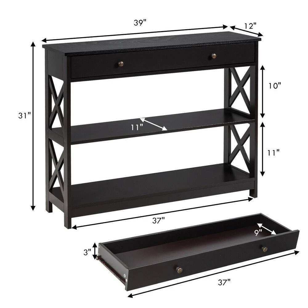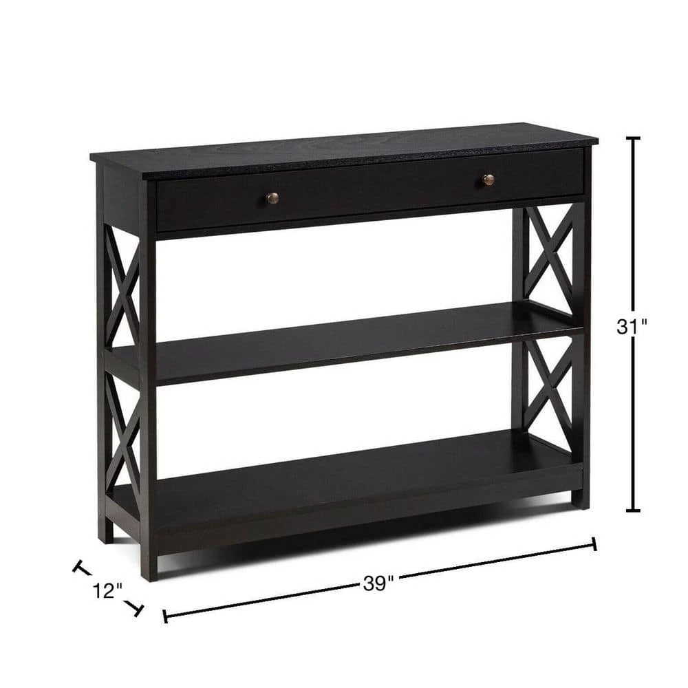 Designed with the spacious table, the large drawer and 2-storage shelves, this wooden sofa table comes with ample storage space for your belongings, such as key, sunglasses, photo frame and more. Made of solid MDF with odorless painting finish, this premium entryway table is durable and stable to hold up to 209 lbs. Measuring with 39” x 12” x 31” (L x W x H) in dimension, this 3-tier console table will make a timeless addition to your living room, hallway and entryway, keeping your home clean and tidy. Buy and decorate your home!