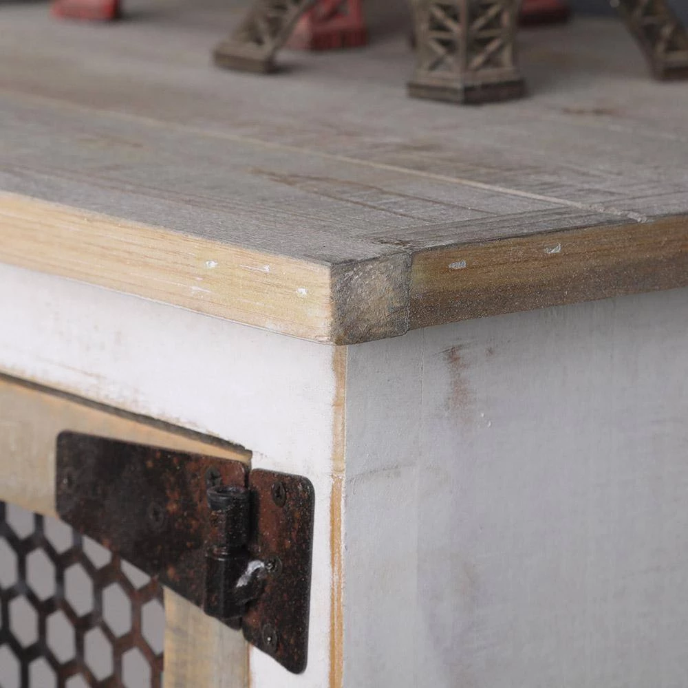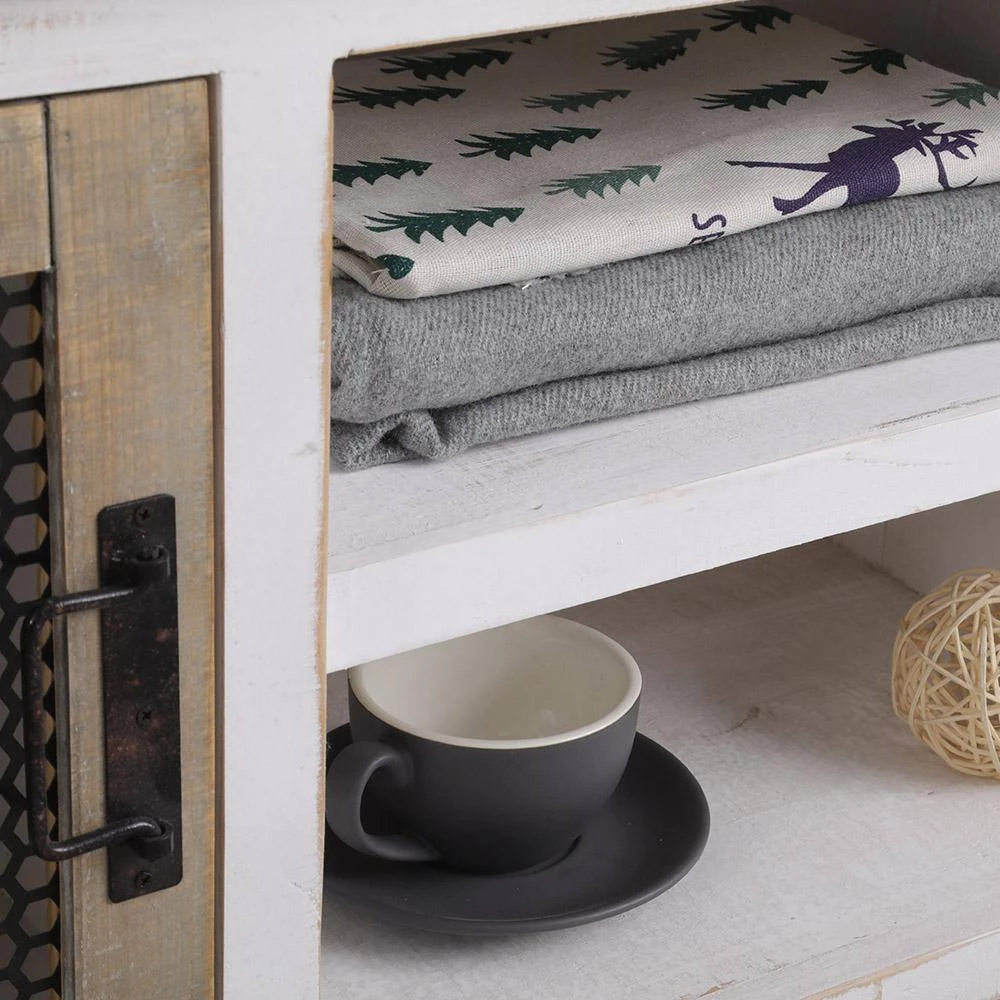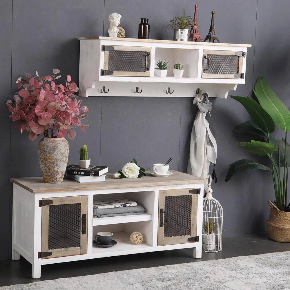 The wall-mounted coat rack captures a smart farmhouse look with a twist that makes it transitional, fitting into many rooms in your home. Sturdy wood construction with beautiful whitewash finish combined with natural finish doors, drawers, and top in a rough-hewn texture. Matte black metal hinges, handles, hooks, and durable metal mesh doors further accentuate and contrast the look along with beaded side panels.