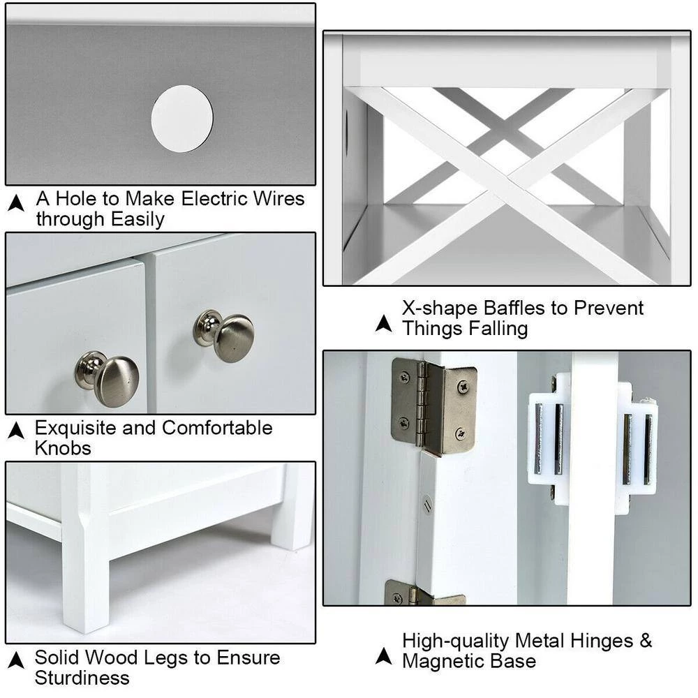 Made of finely select wood, this TV stand with wire hole is sturdy and durable, built for reliable, lifelong use. The 2 cupboards and display shelves provide a large space for placing TV remotes, books, magazines, photo albums, or other items you need at hand, or want as attractive decoration. As well, there is a hidden hole in the back board so you can thread the wires of your many devices in an out of the way fashion that keeps your environment orderly and attractive. Featuring a bright white finish and X-shape wooden panels on both sides, bring a modern style to your living room with this TV stand that blends with any home decor. This cabinet can be used in your living room, bedroom, kitchen, or bathroom to help you to satisfy storage needs throughout your home. The unit is easy to quickly assemble.