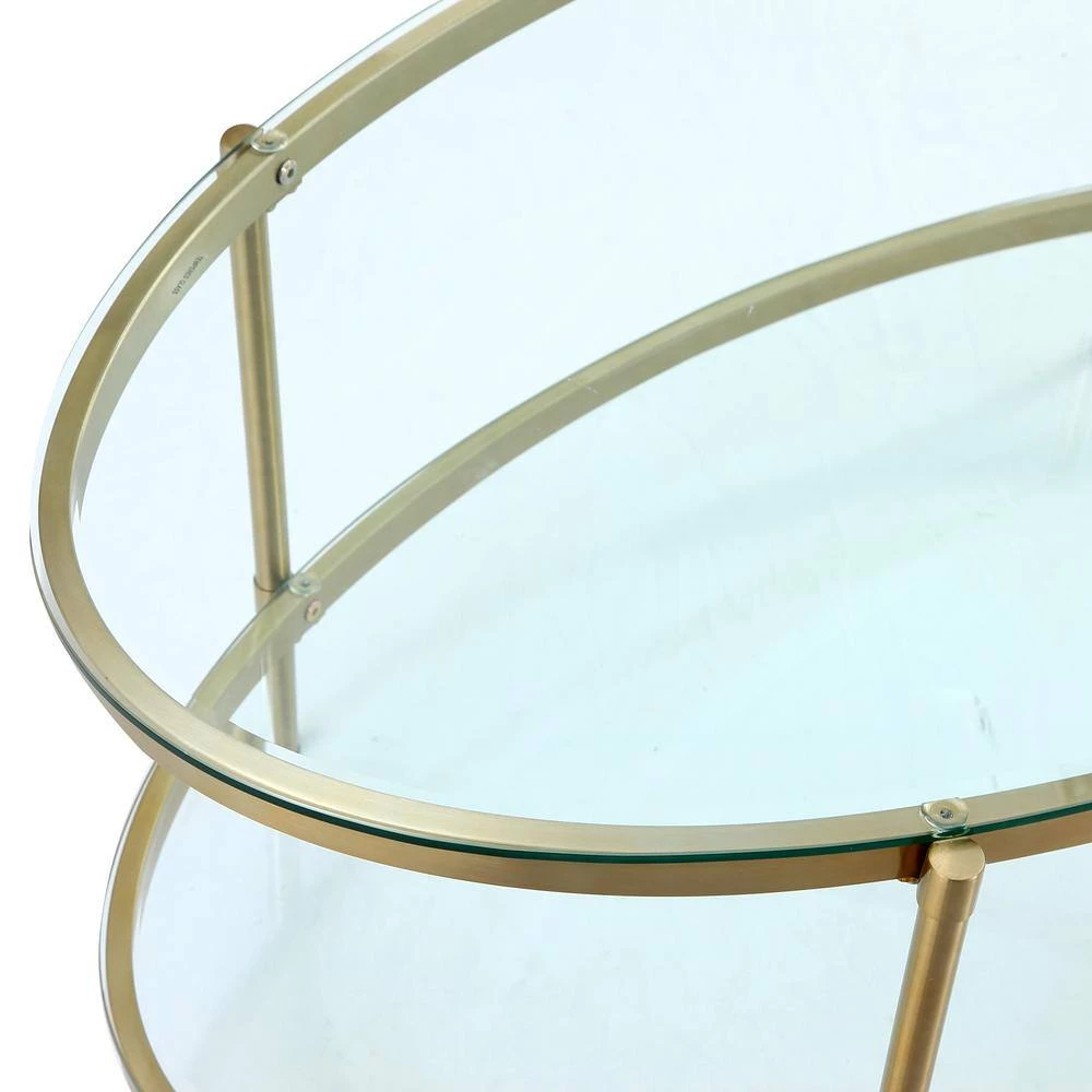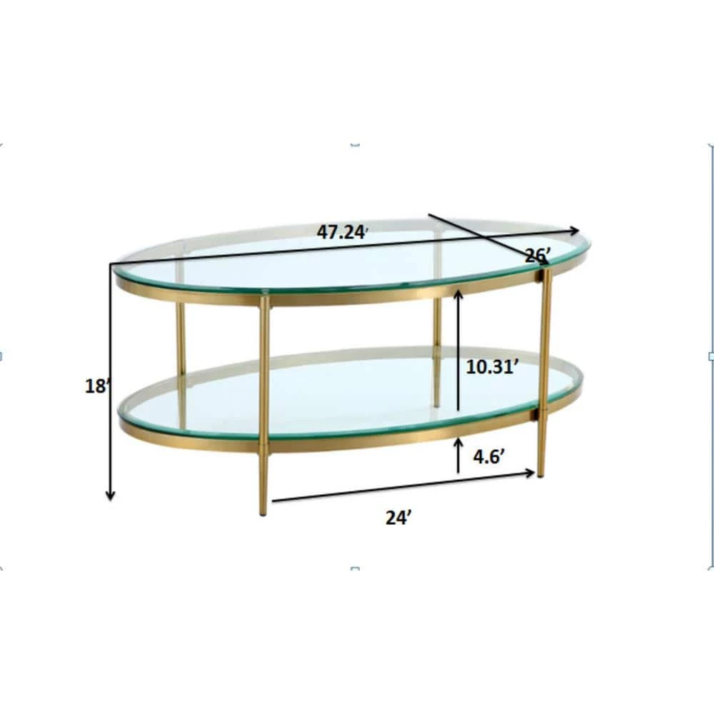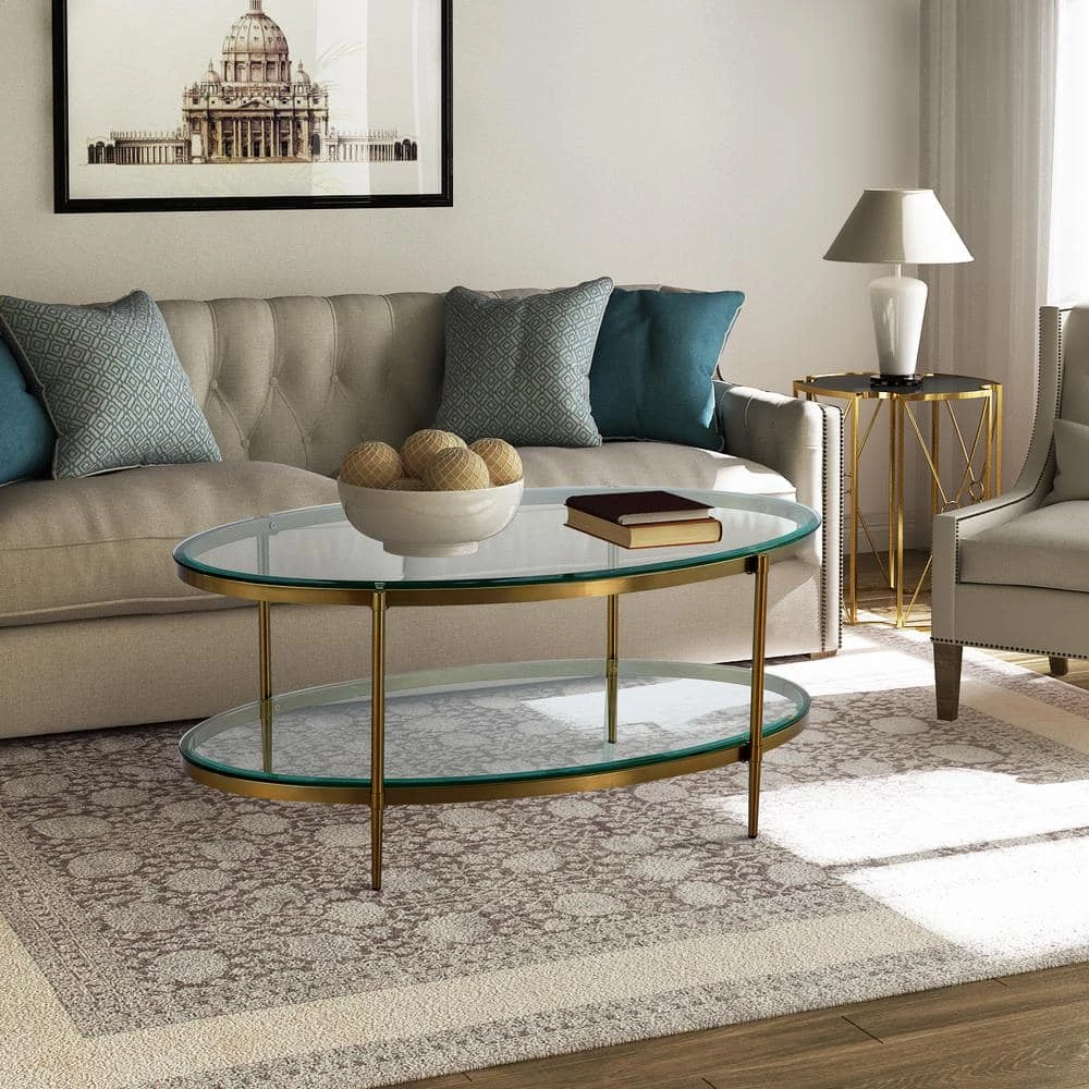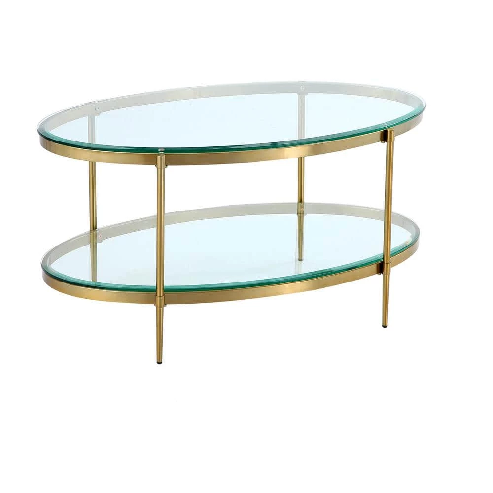 Modernize your living space with the addition of this oval glass coffee table. The oval design features a tempered glass top with a hand-painted, aged gold finish. Durable iron construction provides support for this sophisticated coffee table, which coordinates beautifully with black furniture or gold-accented decor.
