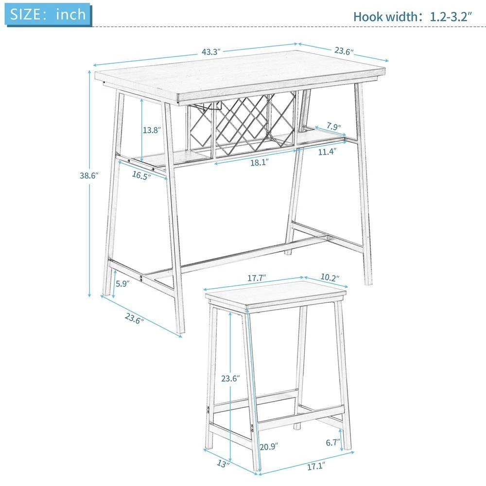 - Product comes with a 12-month warranty, table dimensions: 43.3 x 23.6 x 38.6 in.; stool dimensions: 17.7 x 10.2 x 23.6 in.