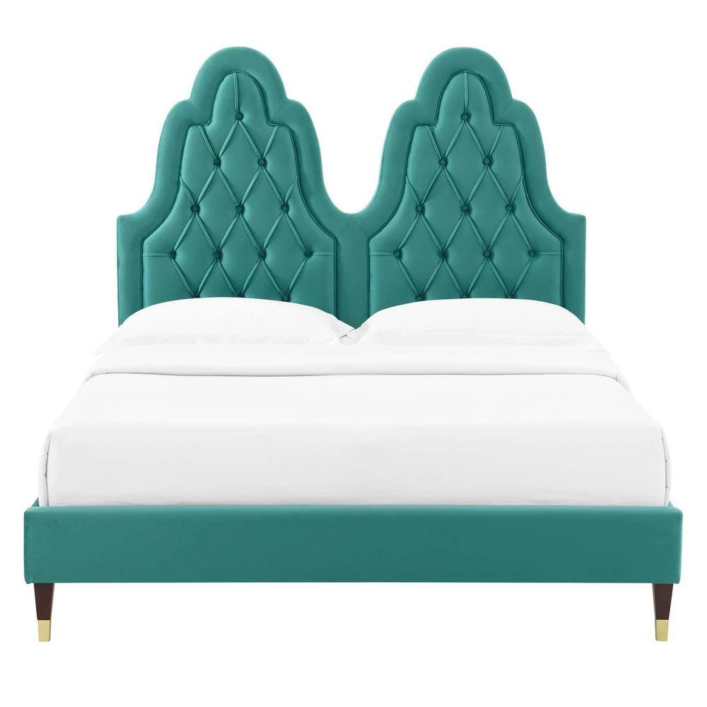 Vintage glamour and regal aesthetics unify on the Alexandria Performance Velvet Twin Platform Bed. A luxurious addition to a guest bedroom or kid’s bedroom, the twin headboard on this platform bed features beautiful diamond tufting, French piping detail, and a stunningly unique silhouette. Covered in soft, stain-resistant performance velvet, this upholstered bed is complete with a foam padded headboard granting ultimate comfort and support while sitting up and relaxing in bed. This velvet bed is a sturdy mattress foundation for memory foam, innerspring, latex, and hybrid mattresses. Eliminating the need for a box spring, the MDF frame of this twin size bed is complete with a wood slat support system crafted with poplar for lasting durability and support. This slatted bed frame rests on gold metal legs with non-marking foot caps and includes a reinforced center beam with two support legs for enhanced stability. Assembly required. Weight Capacity: 800 lbs.