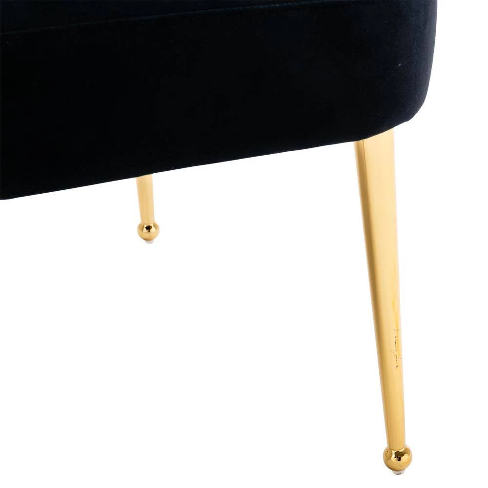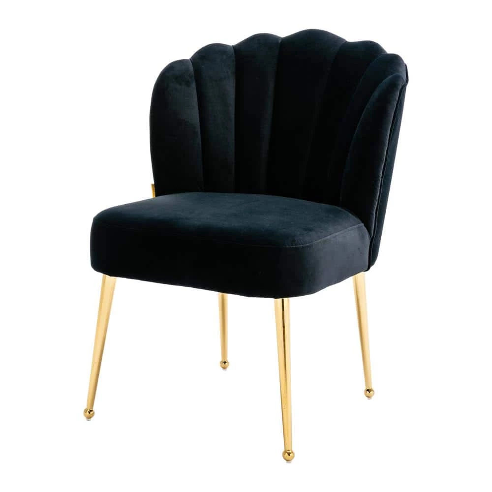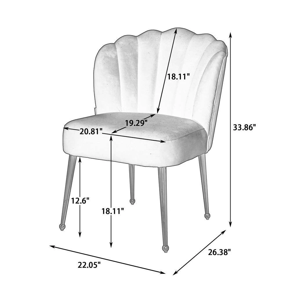 This modern style accent chair is perfect for small spaces, whether you pull it up to your dining table or complete your living room with an extra seat. Elegantly upholstered velvet curves meet sleek metal legs. The scalloped shell backrest creates an artistic elegance that gives this chair a contemporary flair and adds a chic ambiance to your dining room, den or bedroom.