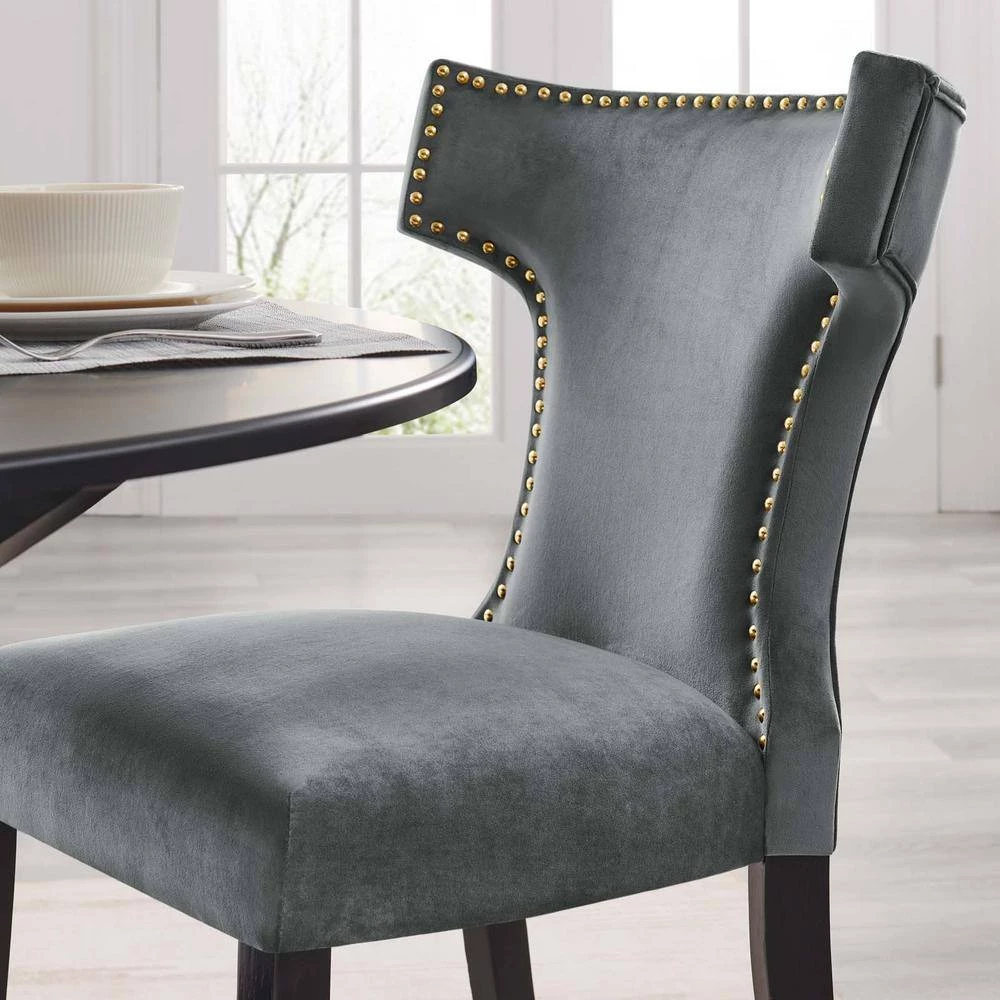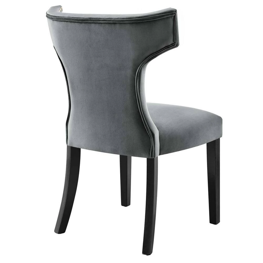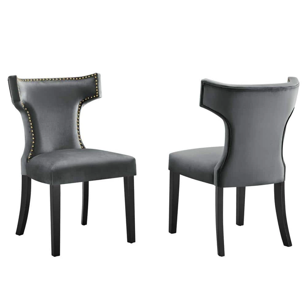 Transform your dining decor with the broadly designed Curve Performance Velvet Dining Side Chairs, Set of 2. Sweeping lines complement a minimalist shape for a chic look studded with nailhead trim. With a sinuous spring support system for a premium seating experience, Curve comes generously padded with dense foam covered in stain-resistant performance velvet, non-marking foot caps, and delivers just the right touch of finesse with tapered wood legs. Sporting an hourglass shape, Curve works well in a variety of dining room arrangements or as accent chairs in your office or living space.