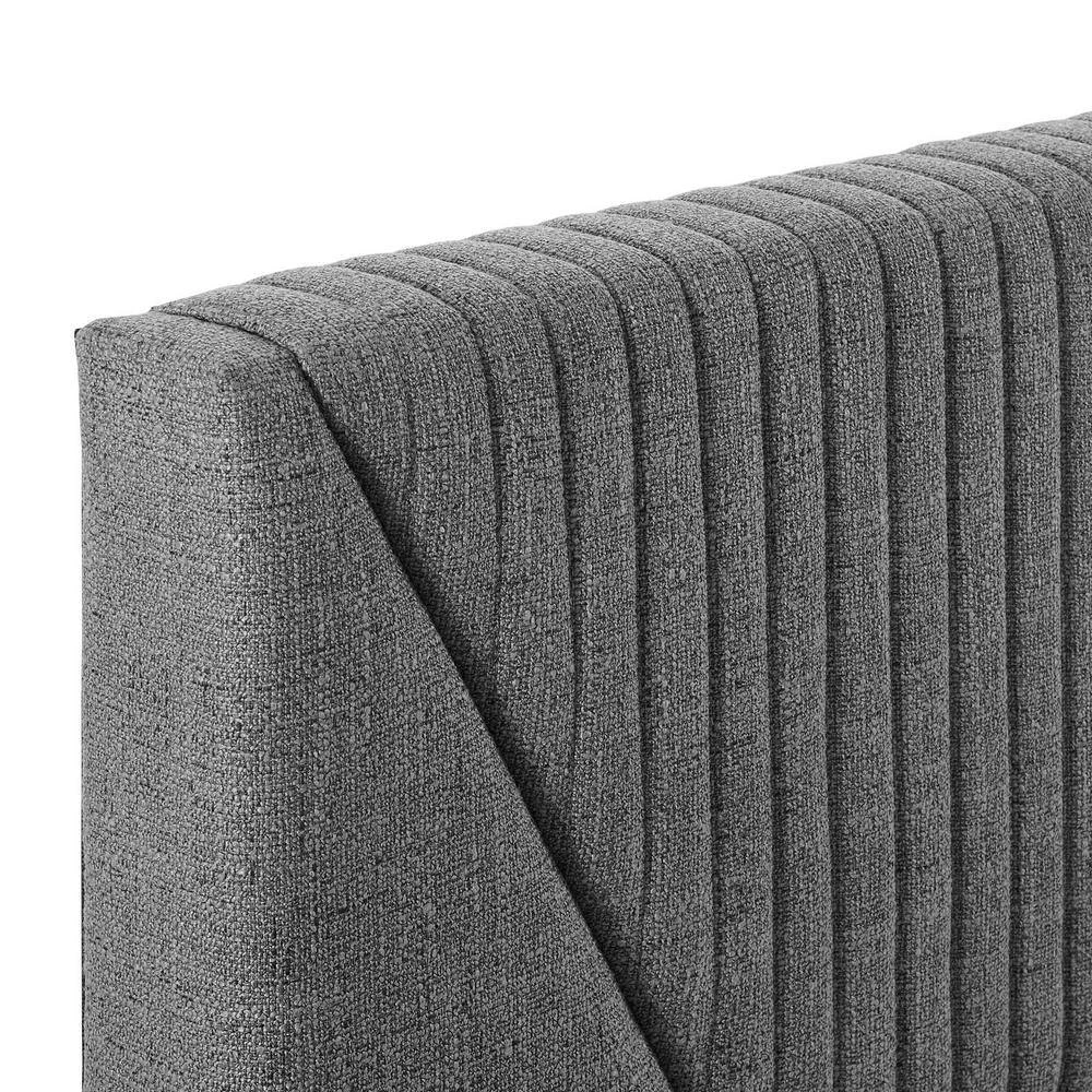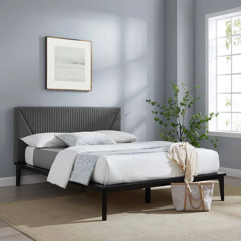 Restyle your bedroom decor with the Dakota Upholstered Platform Bed. Blending contemporary modern design with mid-century style, this platform bed is complete with a padded headboard that’s perfect for resting against while sitting up in bed. This queen bed is upholstered in durable polyester fabric and features a linear design to add interest to the headboard. A wood slat support system eliminates the need for a box spring and encourages ample air circulation to your mattress. A lasting mattress foundation, this platform bed features a sturdy rubberwood construction with a reinforced center beam, support legs, and felt foot pads to protect your flooring. This queen bed accommodates the various mattress types on the market such as memory foam, spring, latex, and hybrid. Mattress not included. Weight Capacity: 800 lbs.