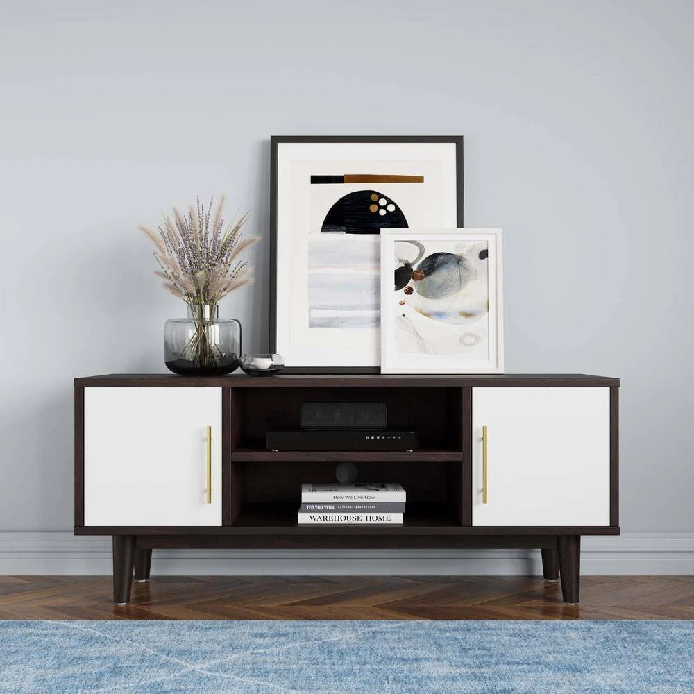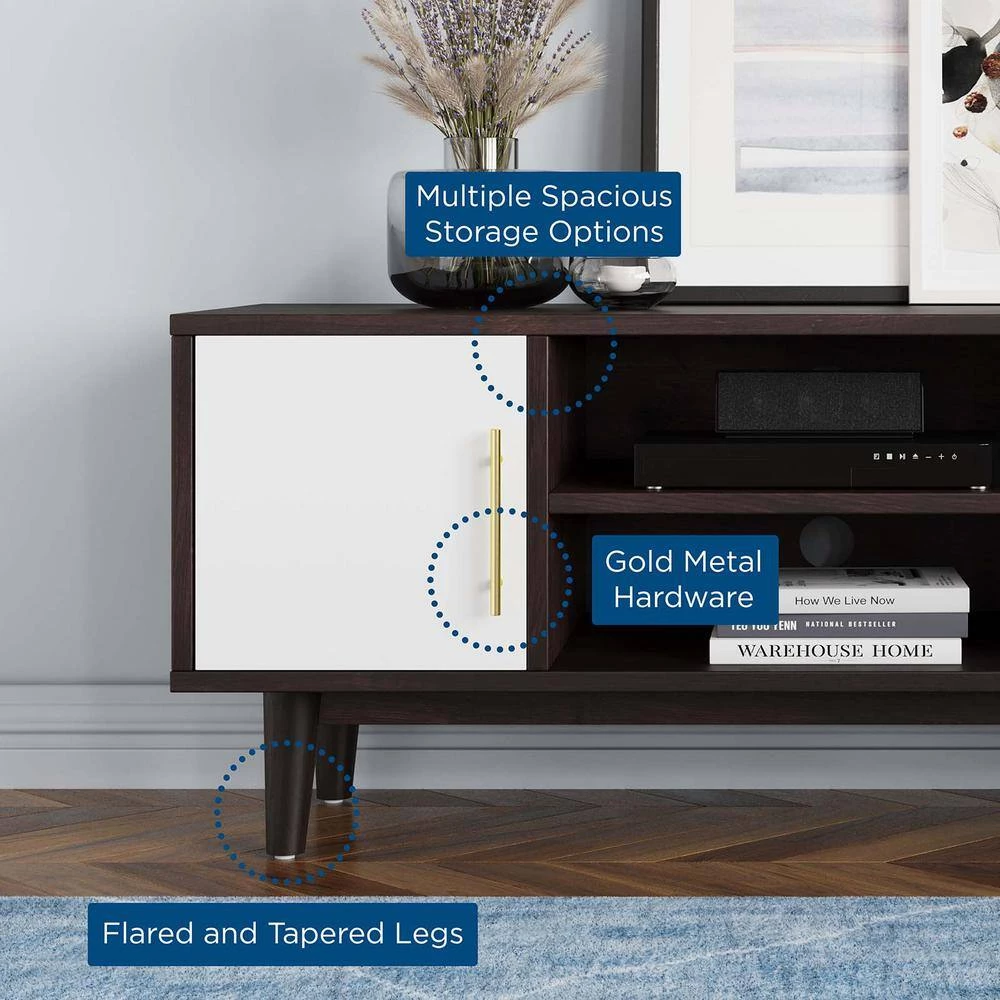 Encourage mid-century modern design in your living space with the Daxton 43″ TV Stand. Sleek lines, splayed legs, gold metal hardware, and contrasting tones create a striking piece for your living room, bedroom, lounge room, or home office. Made with particleboard, MDF, and beautiful wood grain paper lamination, Daxton features ample storage space with an adjustable center shelf and two storage areas behind solid white doors. Cable management holes make this entertainment console ideal for keeping all your media essentials organized. A versatile addition, this television stand can accommodate TV’s up to 46″ and also serves as a display stand for home accessories, decor, and more. Includes non-marking foot pads.