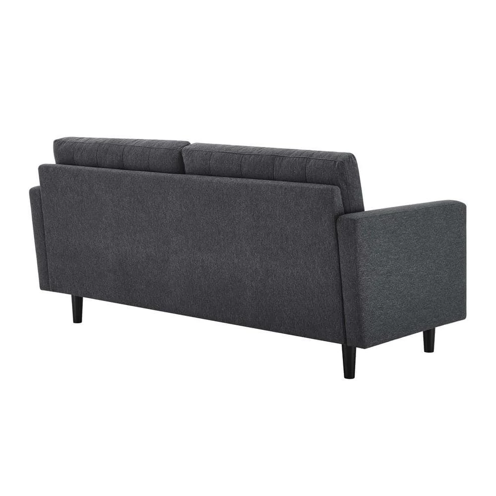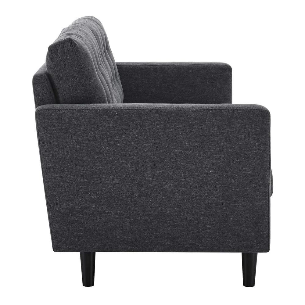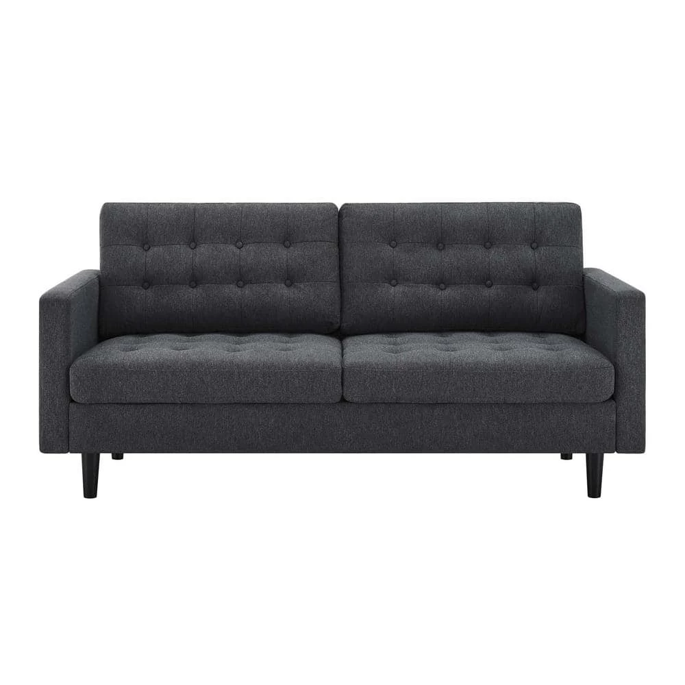 Reinspire decor in a home, office, or apartment with the Exalt Tufted Performance Velvet Sofa. Featuring deep button tufting and rounded edges, this upholstered sofa abounds in glam deco style and mid-century modern design. Covered in soft, stain-resistant performance velvet, this tufted sofa is complete with dense foam padding and a sinuous spring support system for a premium seating experience. This velvet sofa is crafted with durable solid wood and rests on four black wood legs with foot pins to protect flooring. Bring retro modern charm to your living room, bedroom, lounge room, den, or home office with Exalt. Assembly required. Sofa Weight Capacity: 900 lbs.