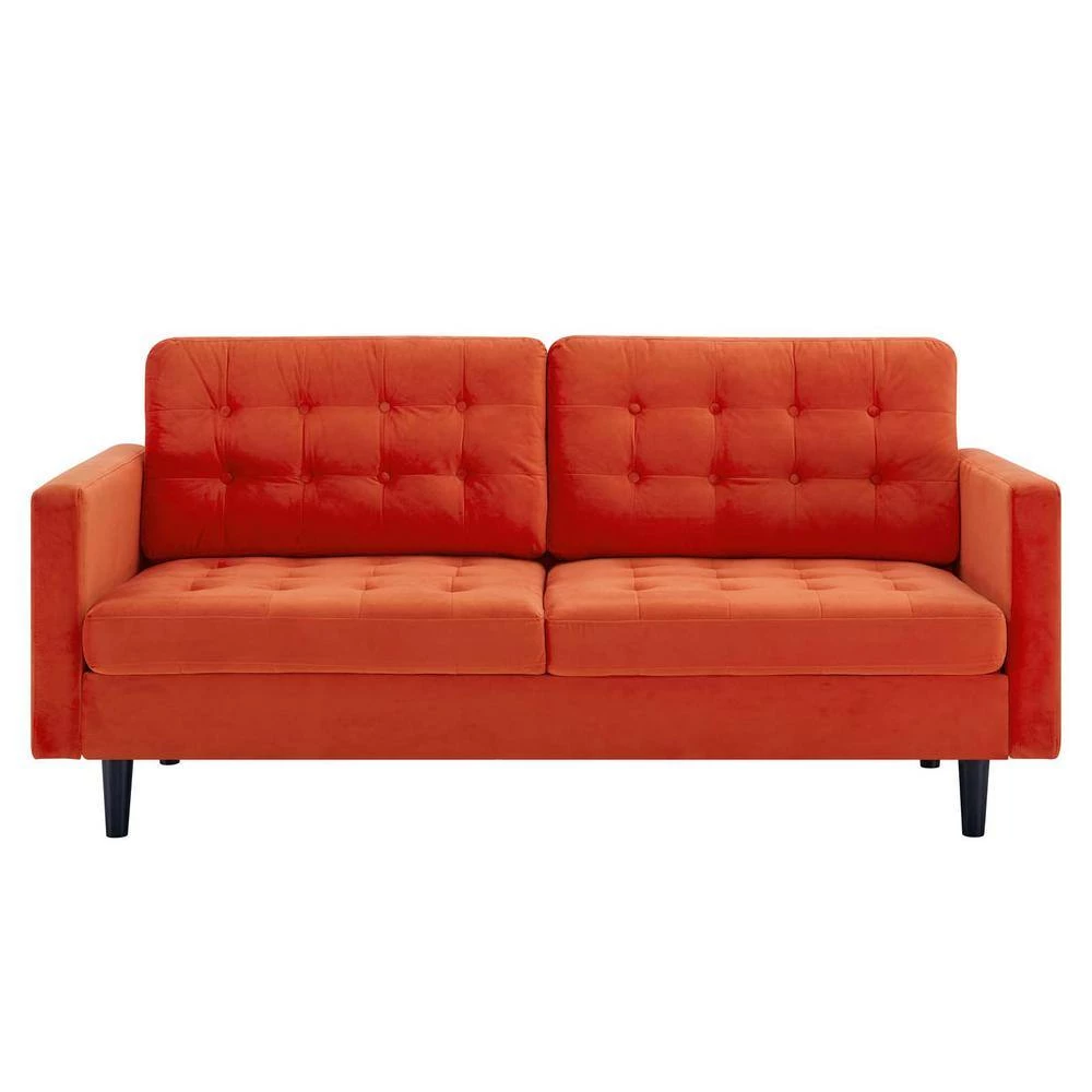 Reinspire decor in a home, office, or apartment with the Exalt Tufted Performance Velvet Sofa. Featuring deep button tufting and rounded edges, this upholstered sofa abounds in glam deco style and mid-century modern design. Covered in soft, stain-resistant performance velvet, this tufted sofa is complete with dense foam padding and a sinuous spring support system for a premium seating experience. This velvet sofa is crafted with durable solid wood and rests on four black wood legs with foot pins to protect flooring. Bring retro modern charm to your living room, bedroom, lounge room, den, or home office with Exalt. Assembly required. Sofa Weight Capacity: 900 lbs.