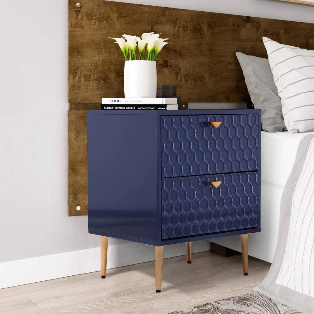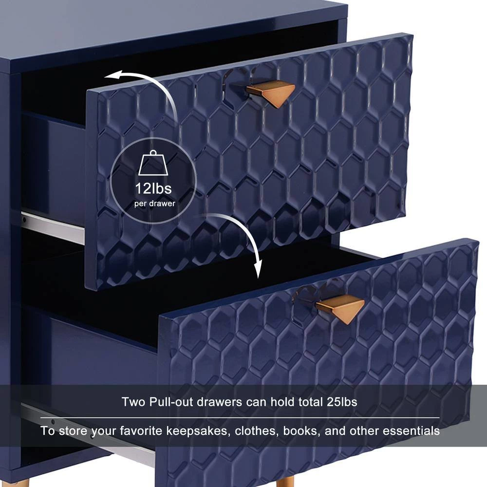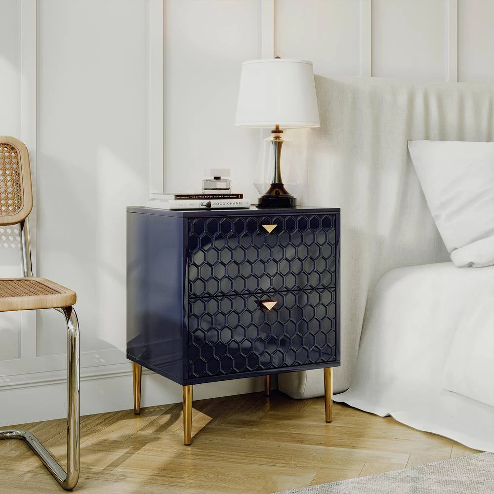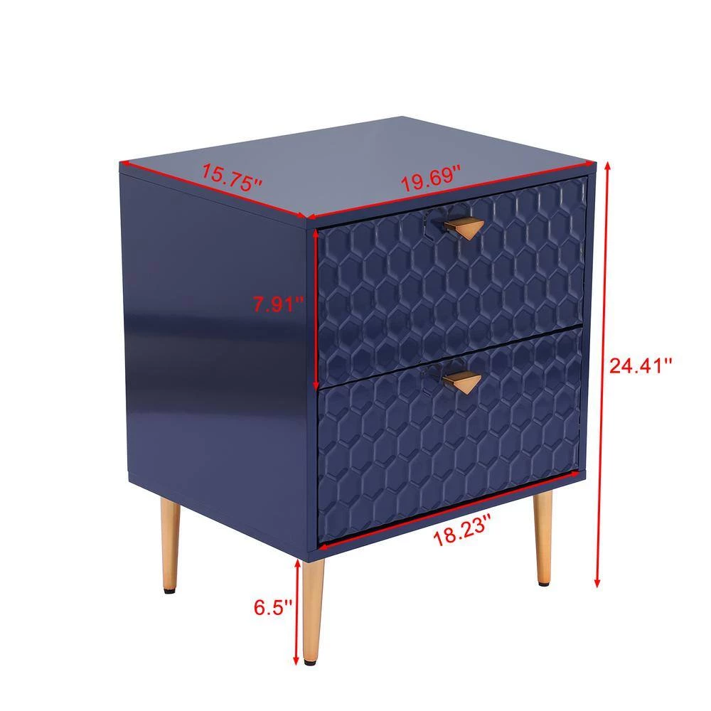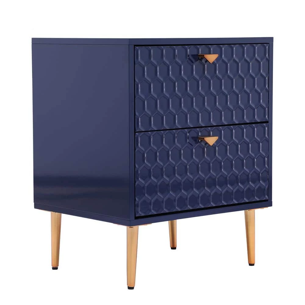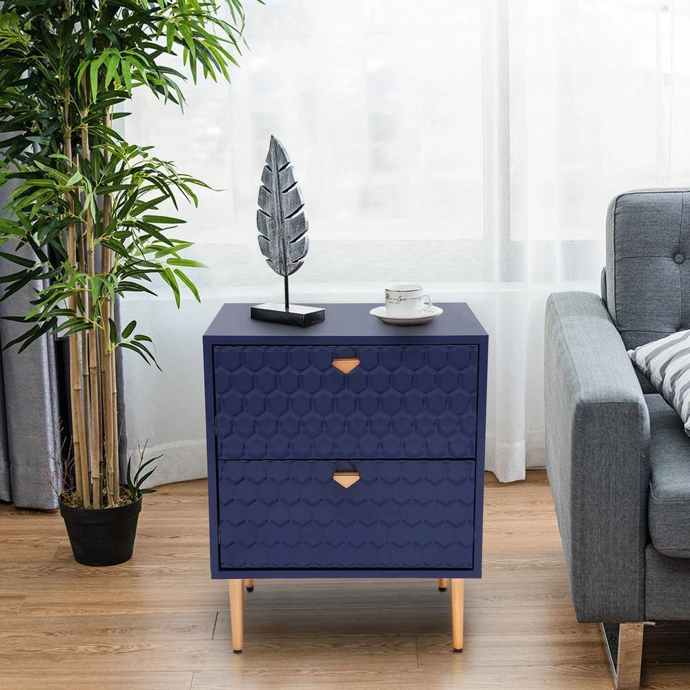 - 2-drawer chest uses tapered golden metal legs, which match the handle to create a charming cohesive appearance