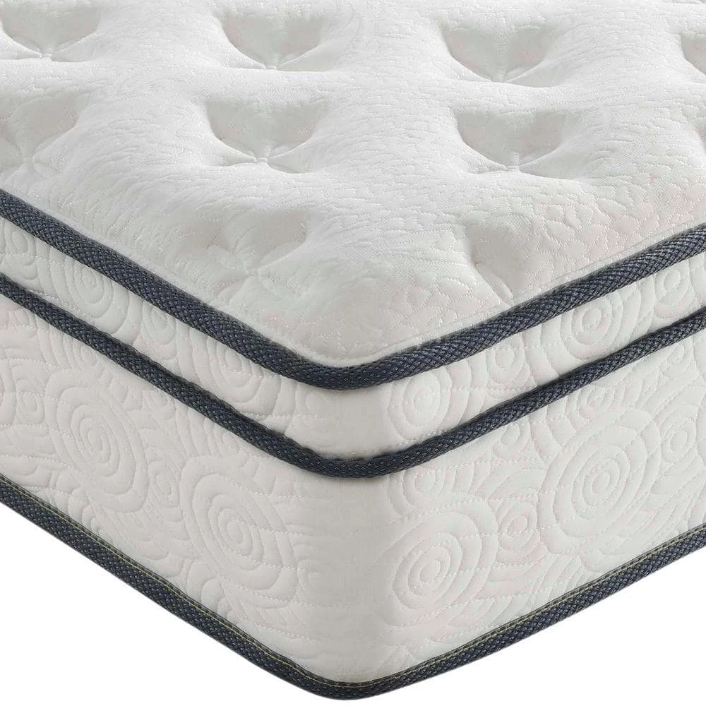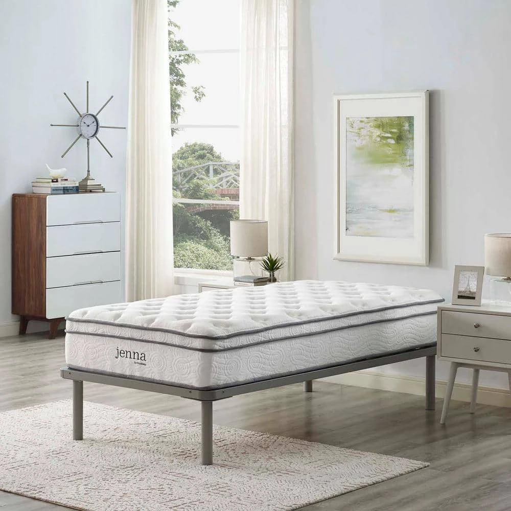 Enjoy rejuvenating sleep with the Jenna 10 Innerspring Mattress. Jenna features individually wrapped pocket coils that isolate motion between sleeping partners. Responsive to the needs of the side, back and stomach sleeping styles, Jenna’s 8.5 in. tall coils come padded underneath two layers of foam for maximum comfort. Complete with a quilted polyester tight-top surface, Jenna relieves pressure on hips, back and shoulders, while delivering a smooth and even feel night after night. Jenna is a firm innerspring mattress that avoids the sag and sink of foam and air mattresses and ships compressed and rolled into a box for easy delivery.