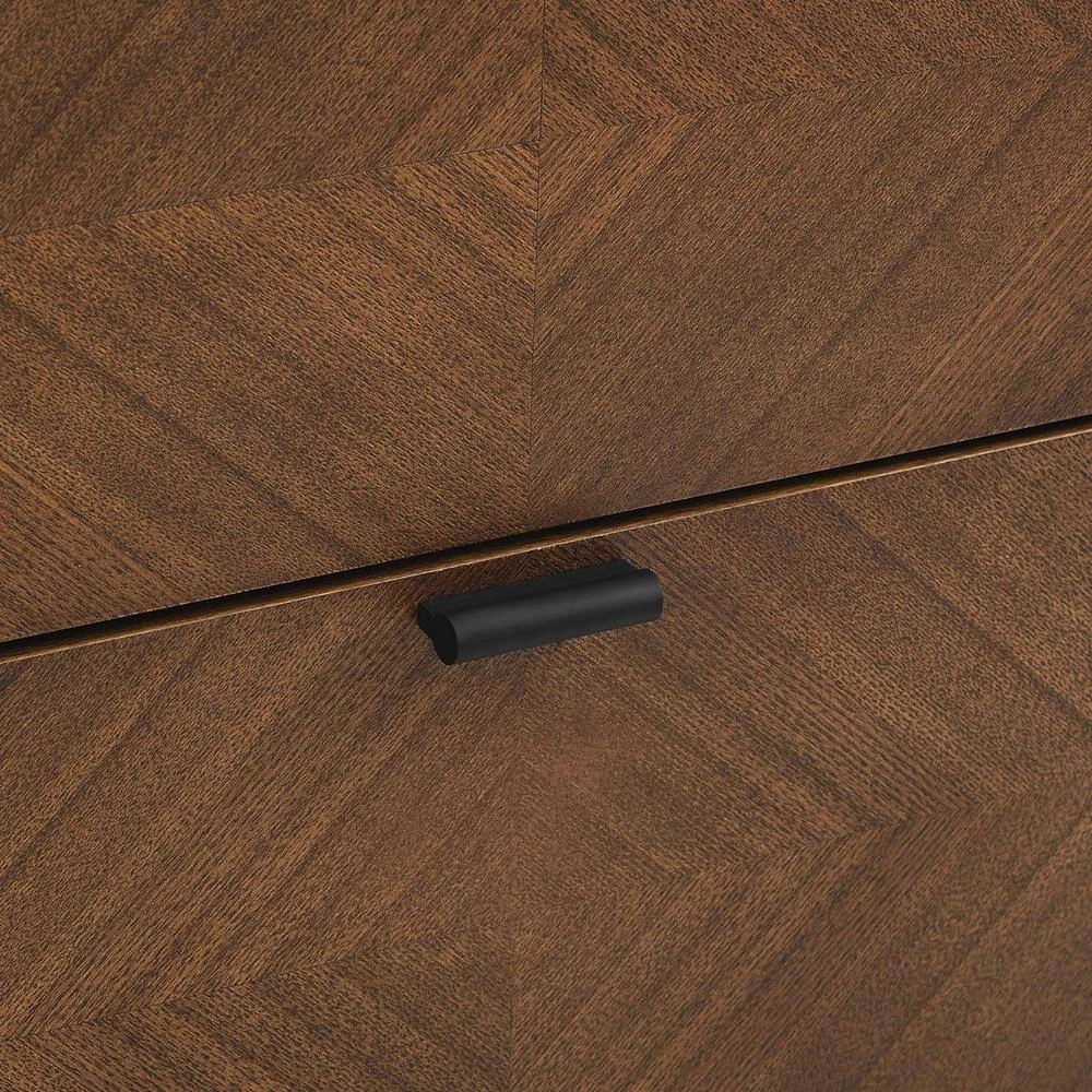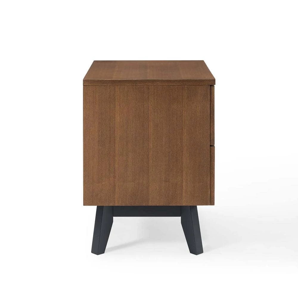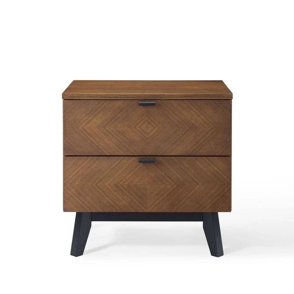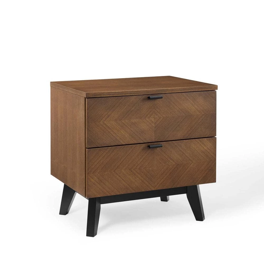 Redirect your bedroom decor with the edgy mid-century modern style of the Kali Wood Nightstand. The Kali End Table showcases beautifully grained brown ash wood veneer with a geometric chevron pattern and dual soft-close easy-glide storage drawers. Solidly constructed from wood and MDF particleboard, the Kali Accent Table rests atop splayed black legs and non-marking foot caps while standing up to your master suite or guest bedroom decor with a commanding presence. Claim center stage in your bedroom and utilize the Kali Wood Nightstand for all your bedside essentials. Assembly required.