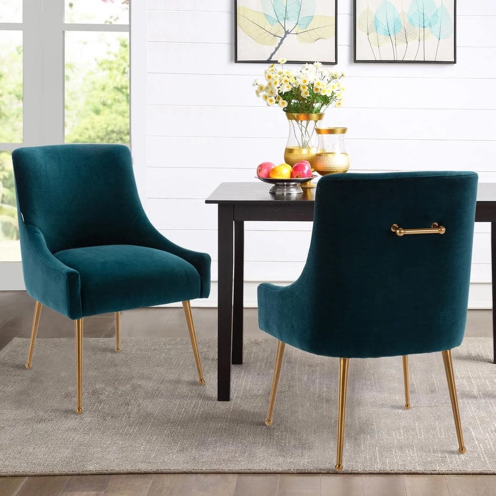 These chairs beautifully covered with a classic velvet upholstery that adds luster to its comfort. The streamline chair body, the rounded chair leg bottom, the metallic brass legs of the chair and the fashionable color combination, every detail adds the luxurious style to this piece. Bring modern style to any seating arrangement by adding this side chair, a perfect perch for kicking back with your latest book club read.