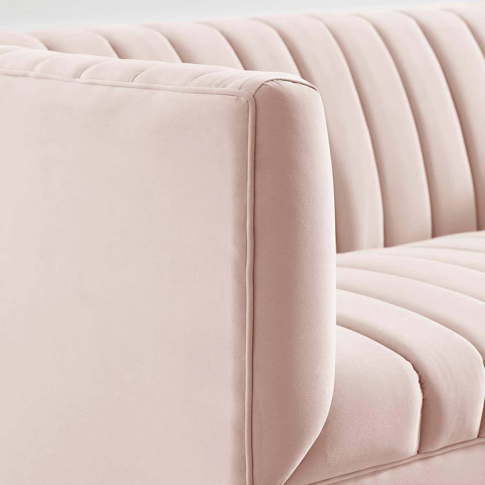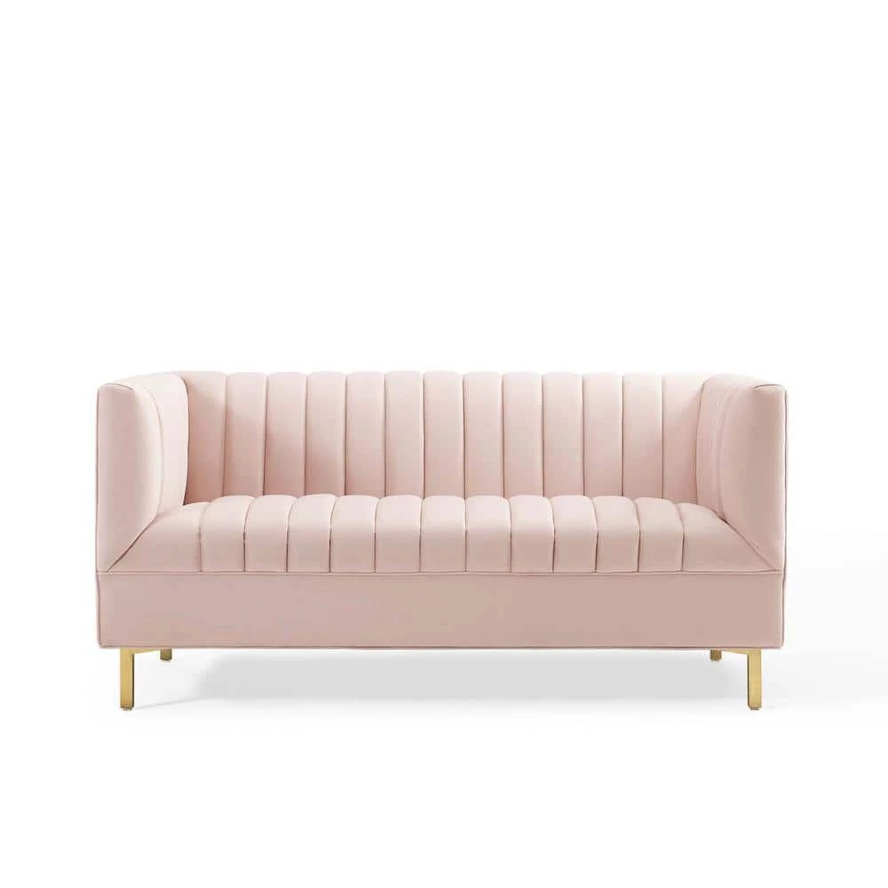 Engage the flowing lines of the Shift Channel Tufted Performance Velvet Living Room Loveseat for a subtle elegance that enhances your living room decor. Shift features interior vertical channel tufted details that adds visual depth to this glam deco two-seater couch. Luxuriously soft and stain-resistant performance velvet upholstery covers this living room loveseat for an elegant piece at home in your living room, lounge room, or office seating area. The Shift Velvet Loveseat rests securely on four gold stainless steel legs with non-marking foot pads to protect flooring. Assembly Required.