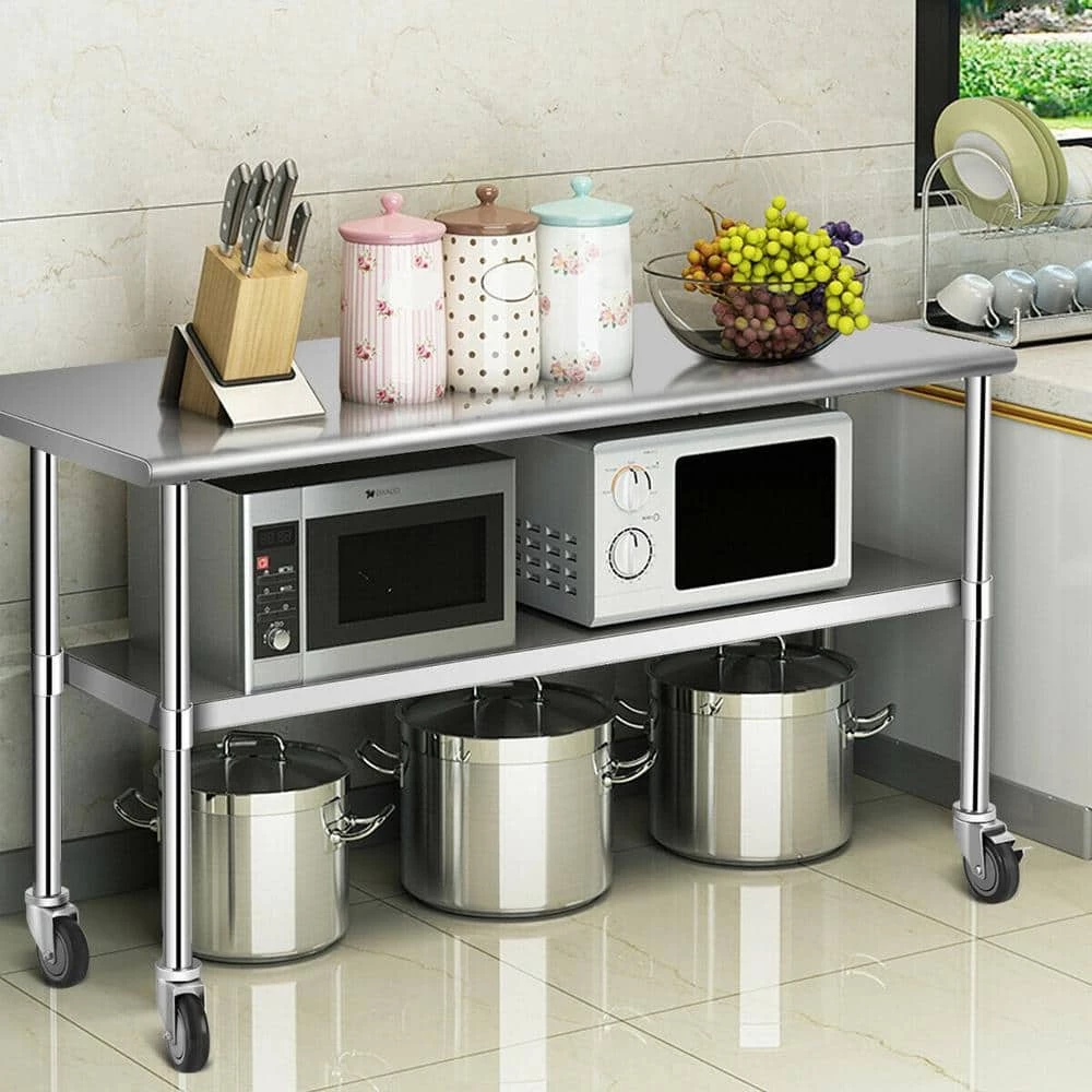 This portable table is made of durable 430-stainless steel to bear large weight and offer more stable service. The handy bottom shelf is fully adjustable to meet your needs for storing and make a good use of space. Most convenient of all, 4-universal wheels ensure you can move the work table smoothly and silently, and 2 of which have brakes for safe use.
